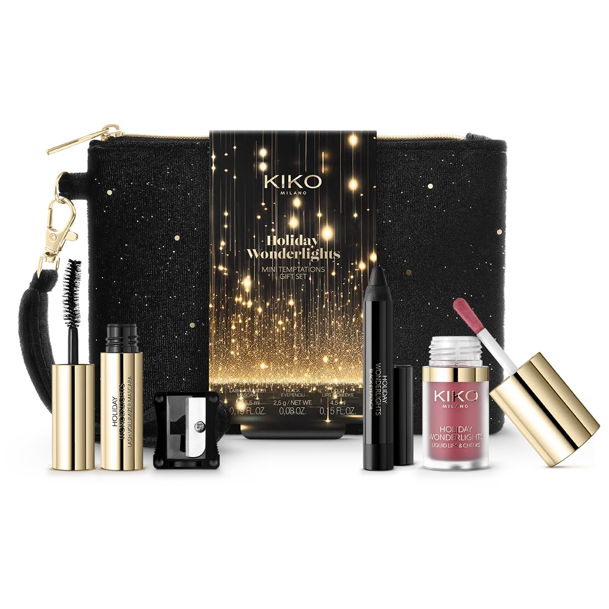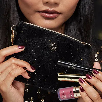 Conjunto de maquiagem para presente composto por uma máscara com efeito volumizador, um lápis de olho preto, um batom e um blush líquido em formato mini, dentro de uma requintada pochete.